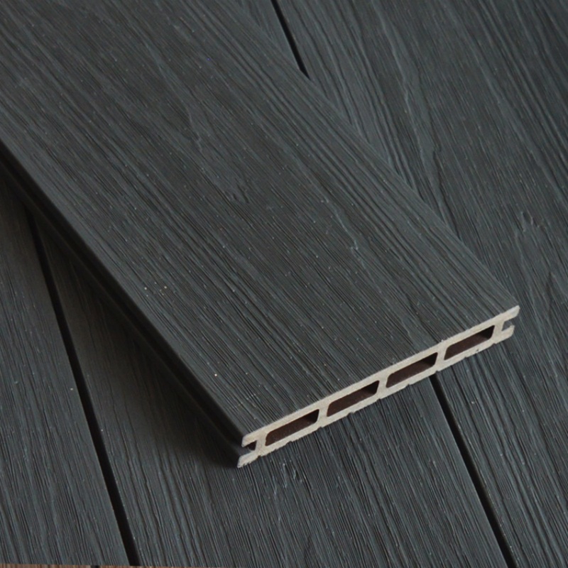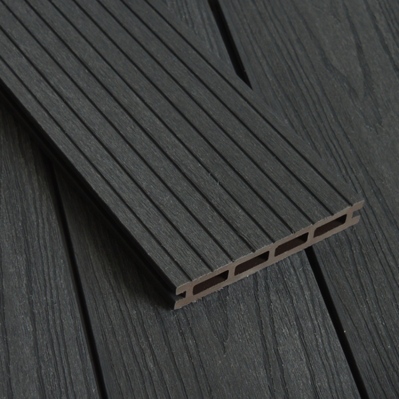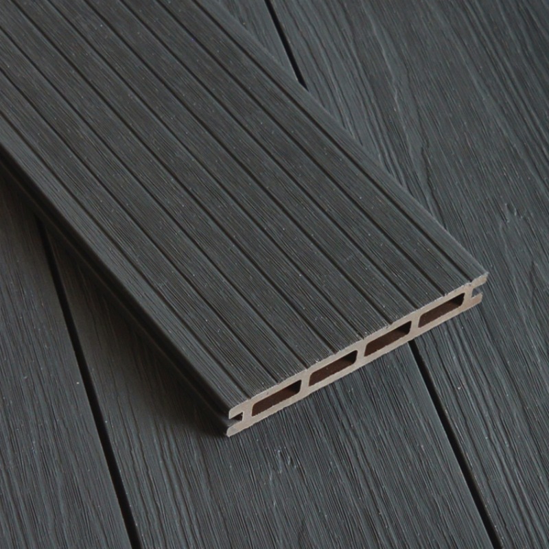 Tarima de exterior de WPC coextruido con agujeros cuadrados, color carbón.