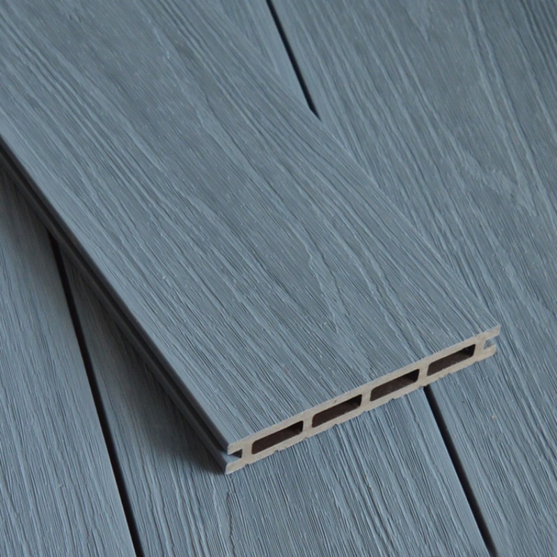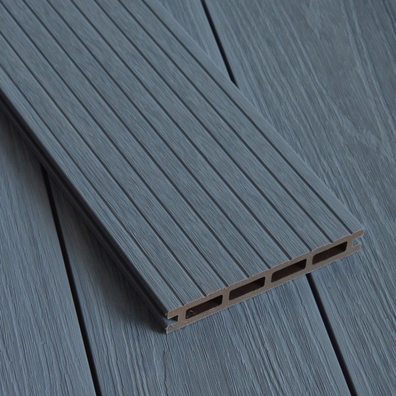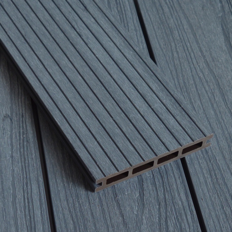 Tarima de exterior de WPC coextruido con orificios cuadrados, color gris claro.