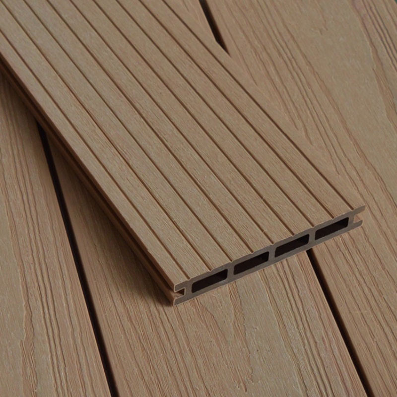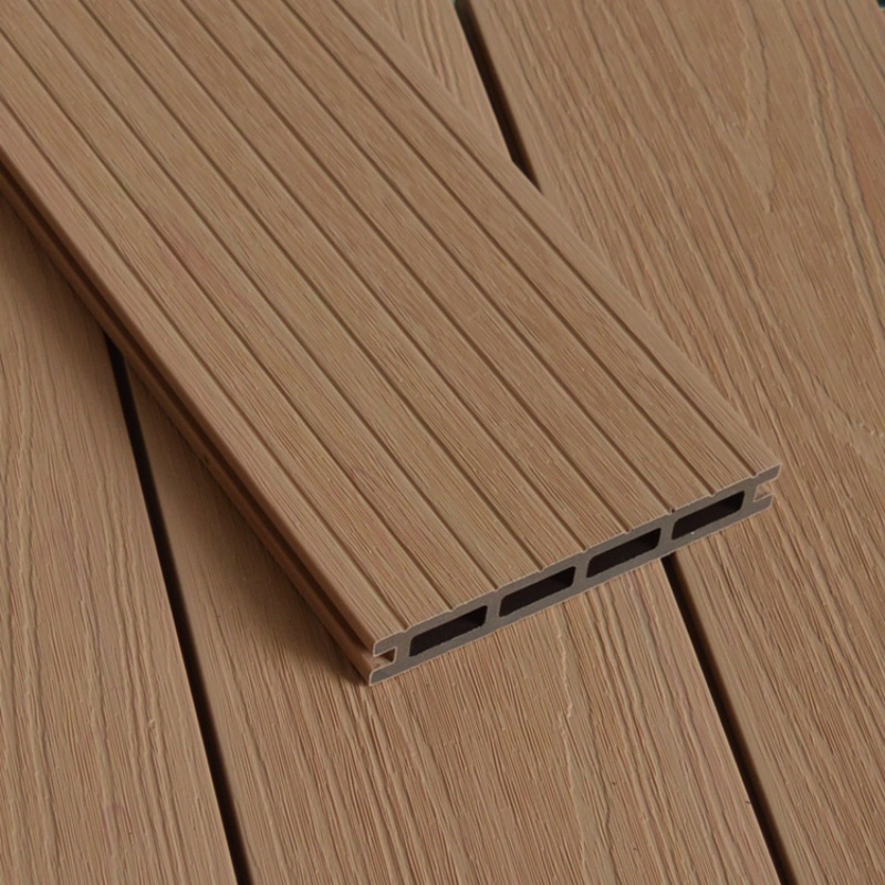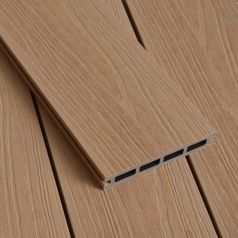 Tarima de exterior de WPC coextruida con agujeros cuadrados, color arce.