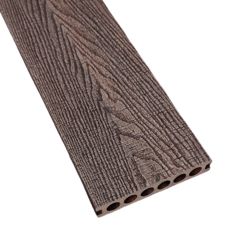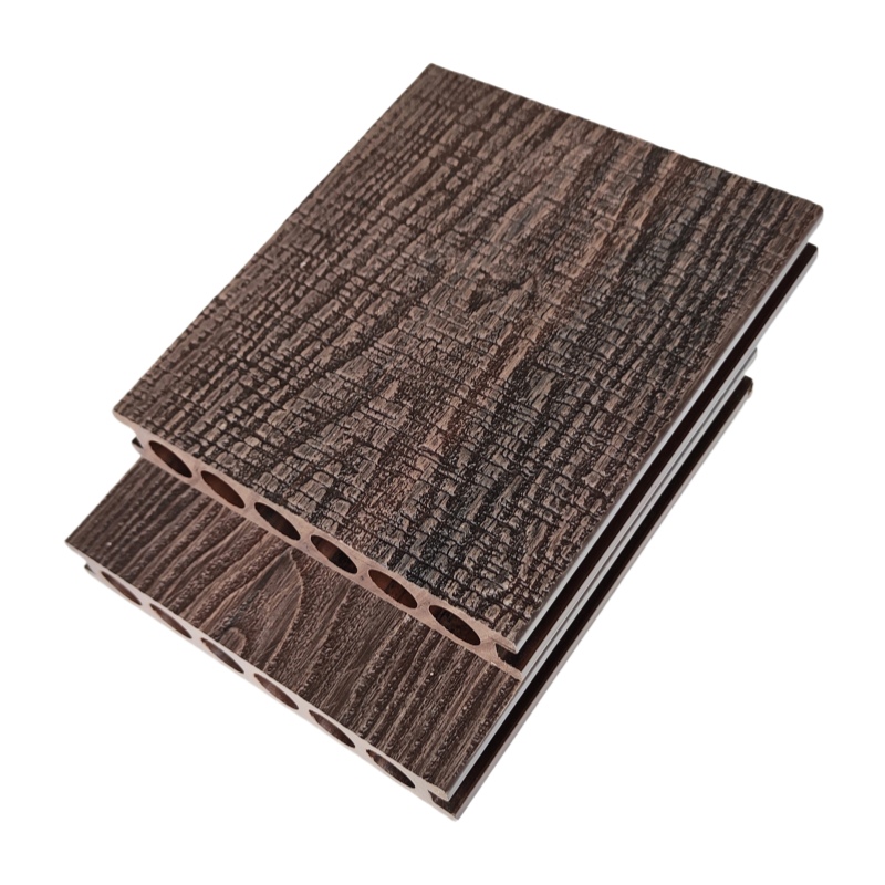Suelo de WPC con relieve profundo en tonos marrón rojizo y negro.